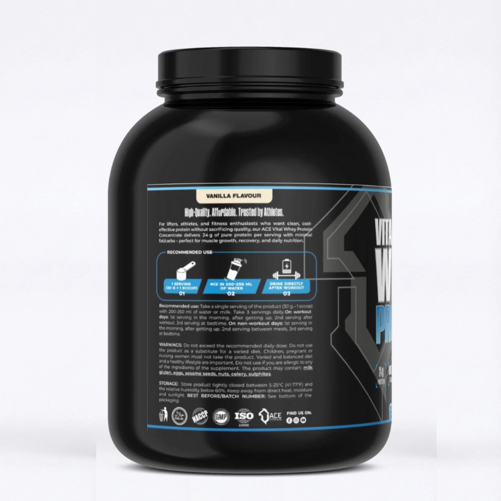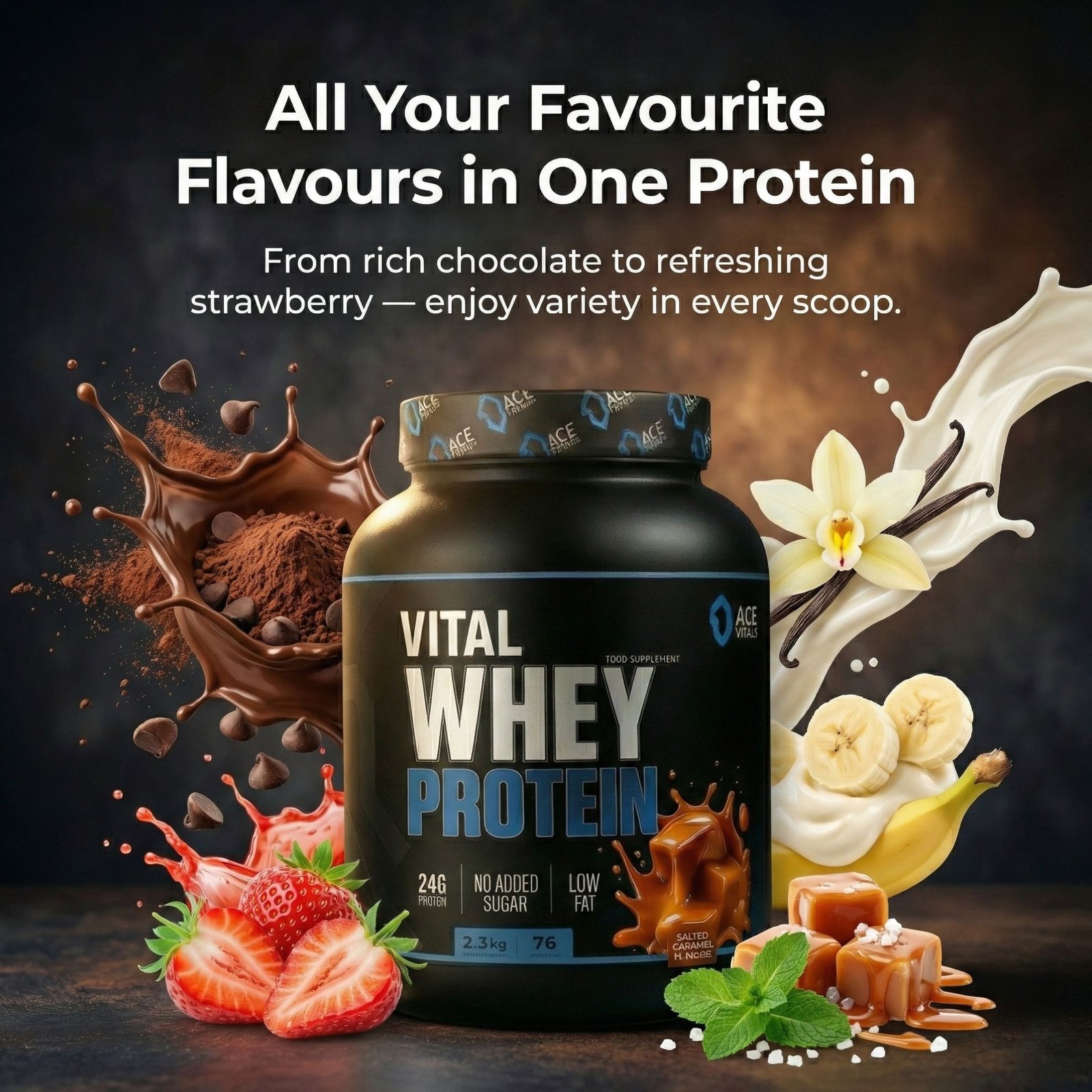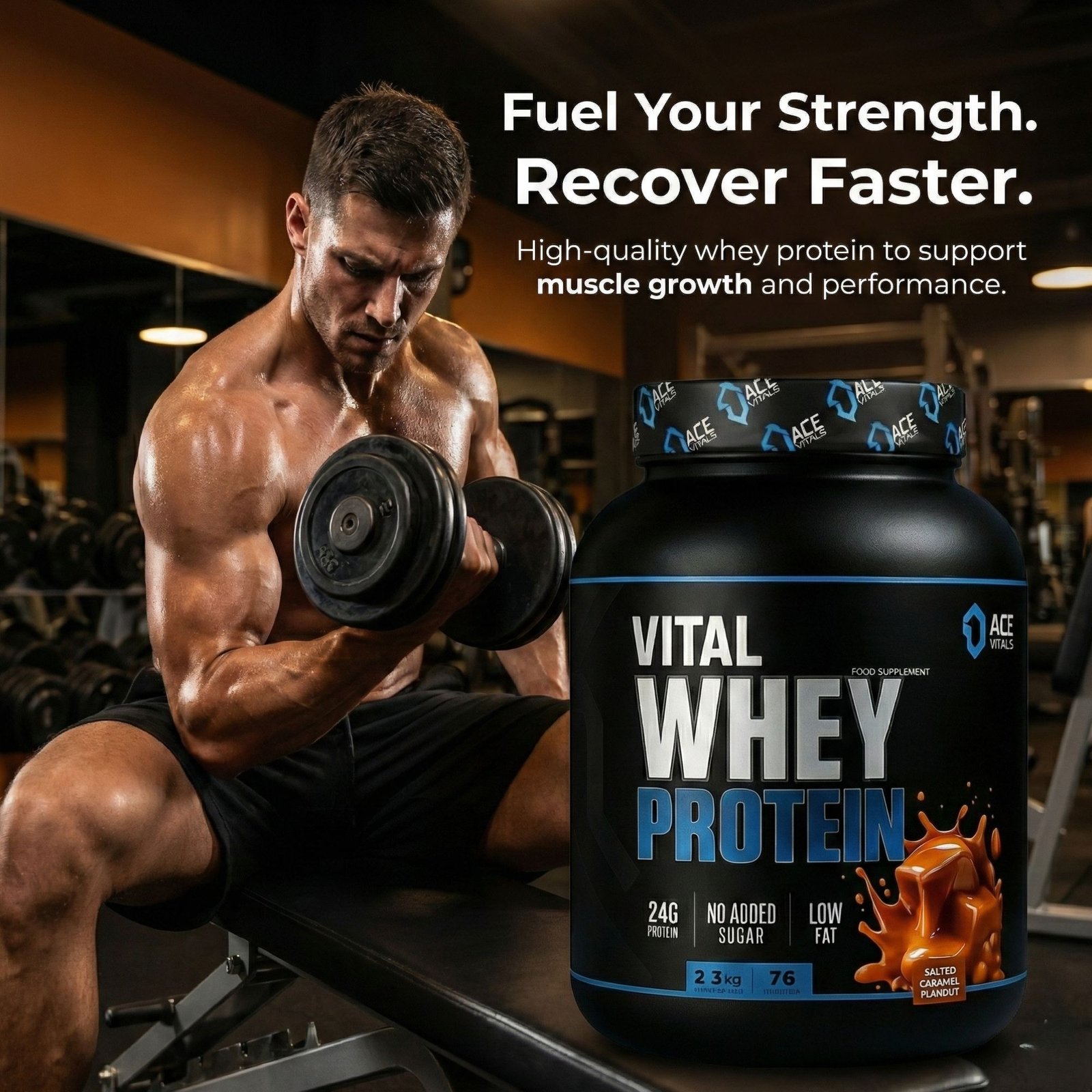 ACE VITALS WHEY PROTEIN powder has been crafted for athletes, fitness enthusiasts, bodybuilders and dieters who want to supplement their nutrition with highest-quality protein.