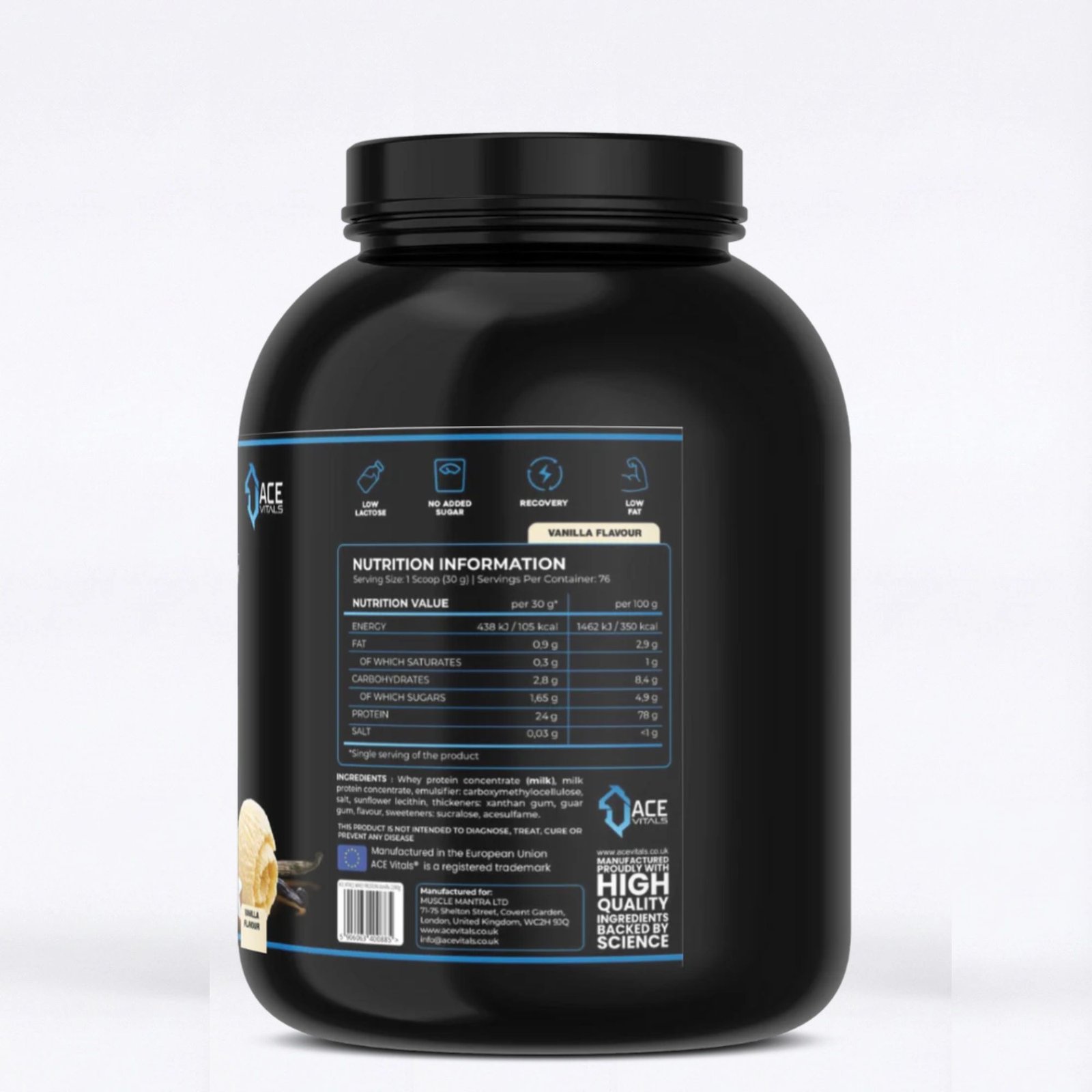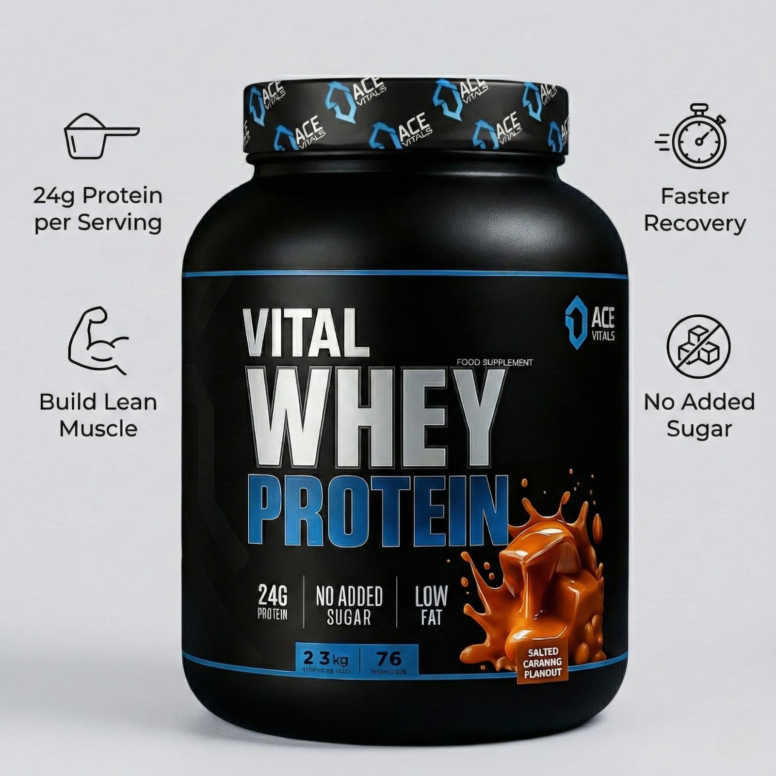- Ace Vitals Whey Protein contains 24g blended protein consisting of whey protein isolate, whey protein concentrate, and whey peptides to support lean muscle mass